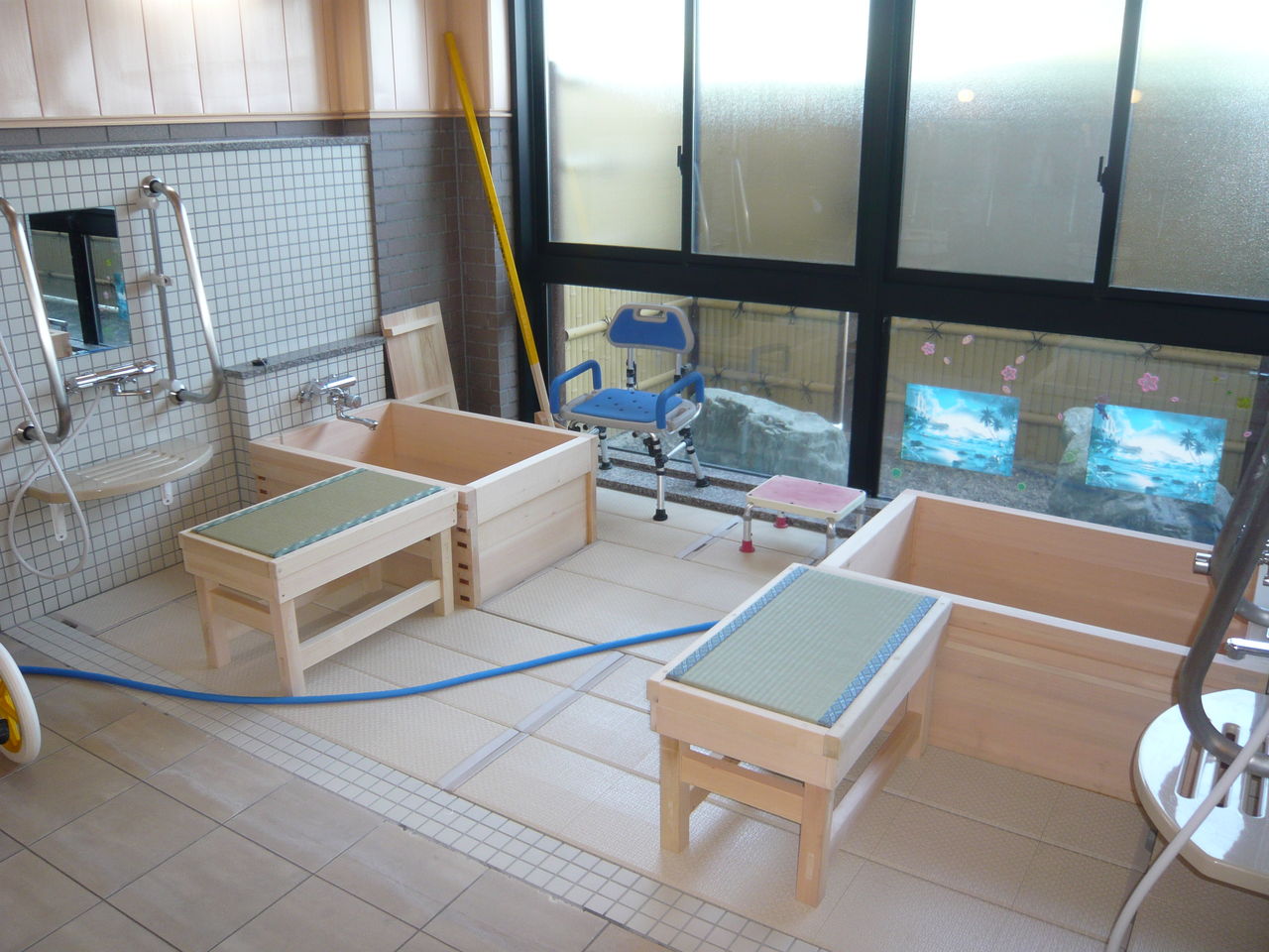これです。まっさらの檜風呂を二つ新調しました。ゆったりサイズの移乗台には施設長が透水畳をはめ込んだので、オシリが冷たくありません。