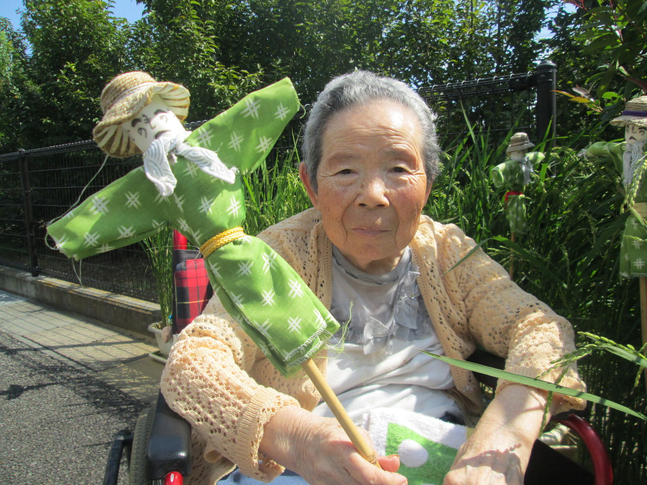デイサービスで育てている、プランター田んぼで手作り案山子がすずめを見張っています。
