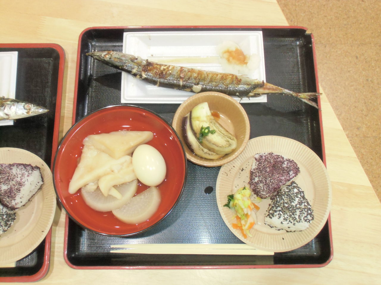 木島平産の新米のおにぎり、北海道から届いた旬のさんま、ふかしなす、おでん、そして温かいなめこ汁にデザートは甘い柿をご用意し、お好きなものを選んでいただきました。