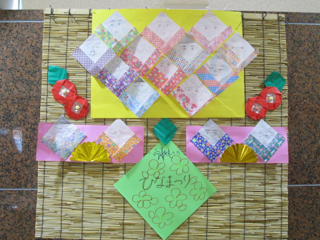 折り紙で作った雄雛と雌雛をお花と一緒に糊付けしました。最後にピンクのリボンを
