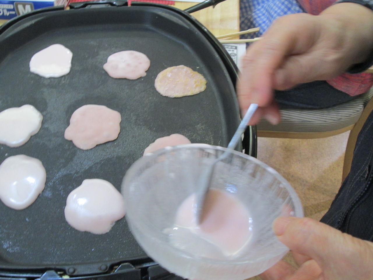 小麦粉と上新粉を水で溶き、食紅を加えてピンク色の生地を作り、それをホットプレートで