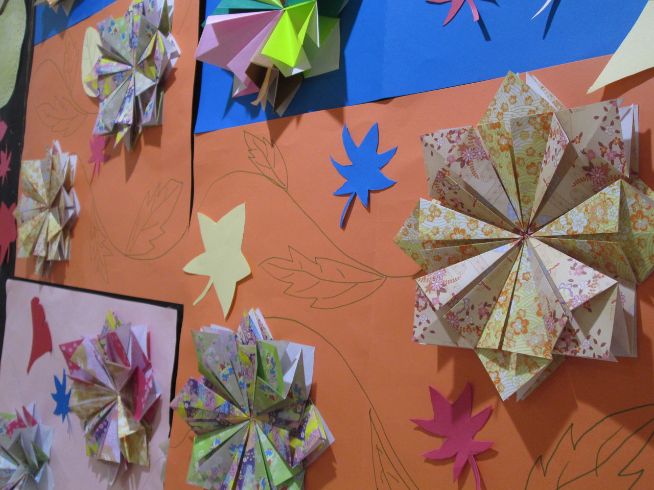 今月の壁飾りは身近で目にする「秋」をいろいろ集めて作品に致しました。