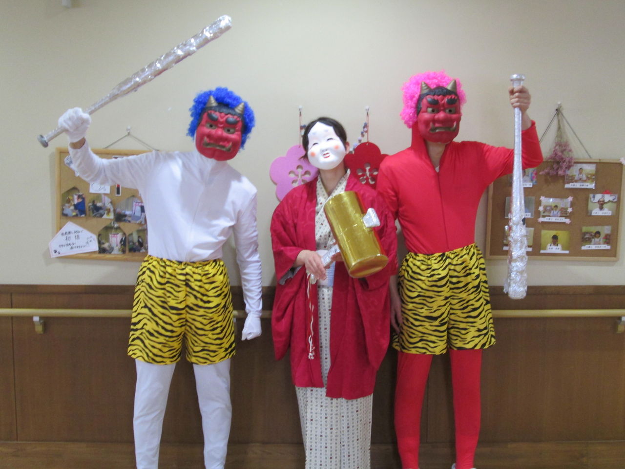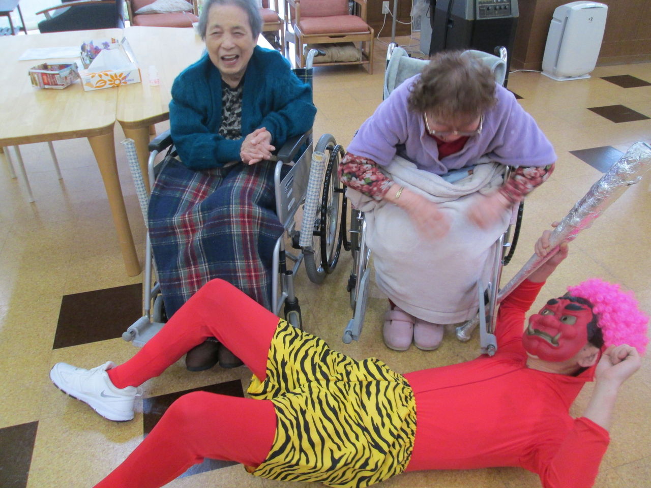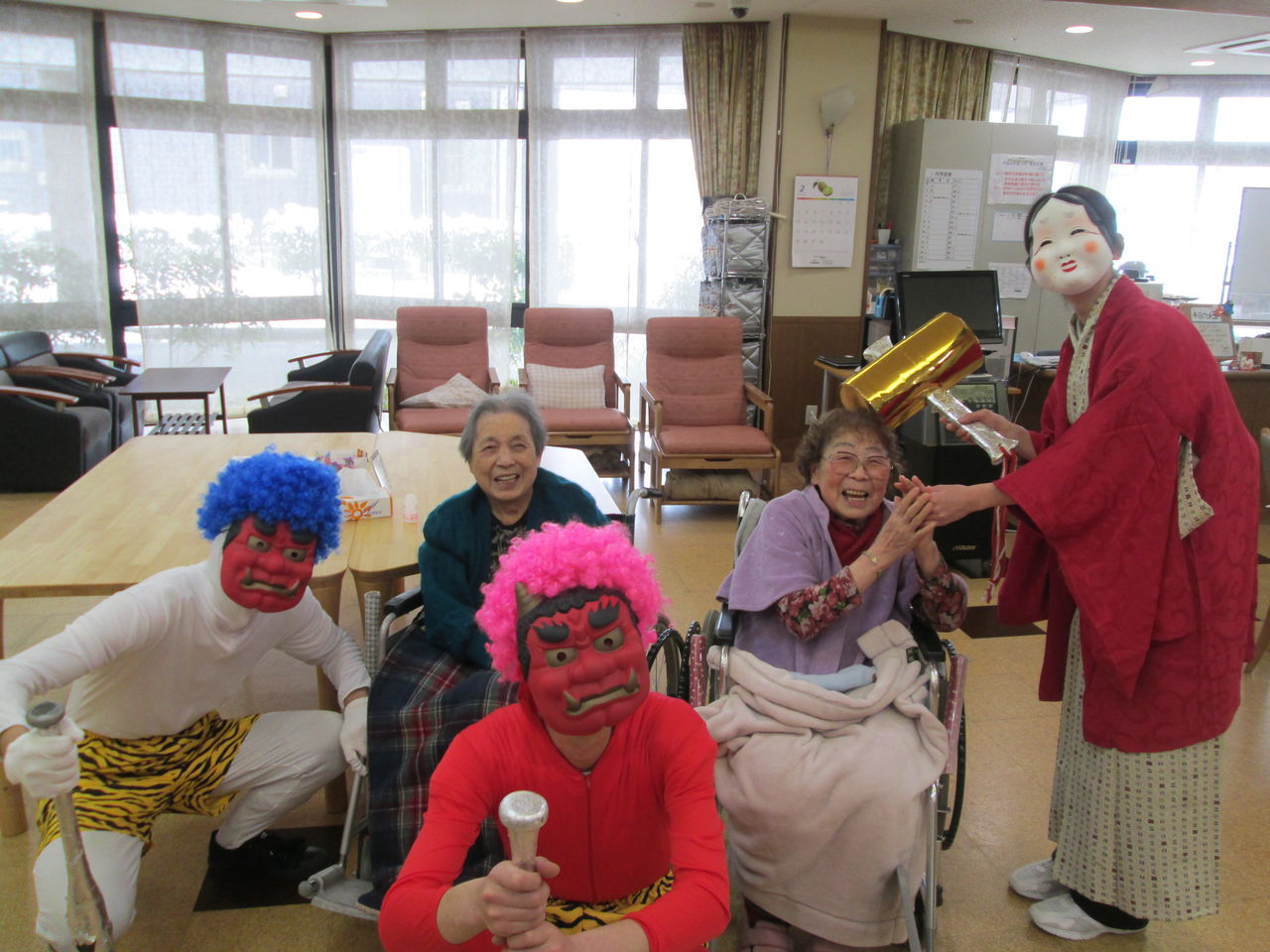 2/2は、デイサービスの皆さんと入所の方々とで、大きな声で豆まきをしました。
