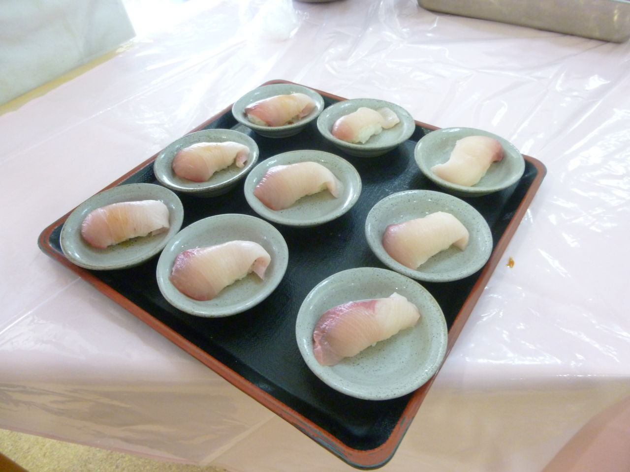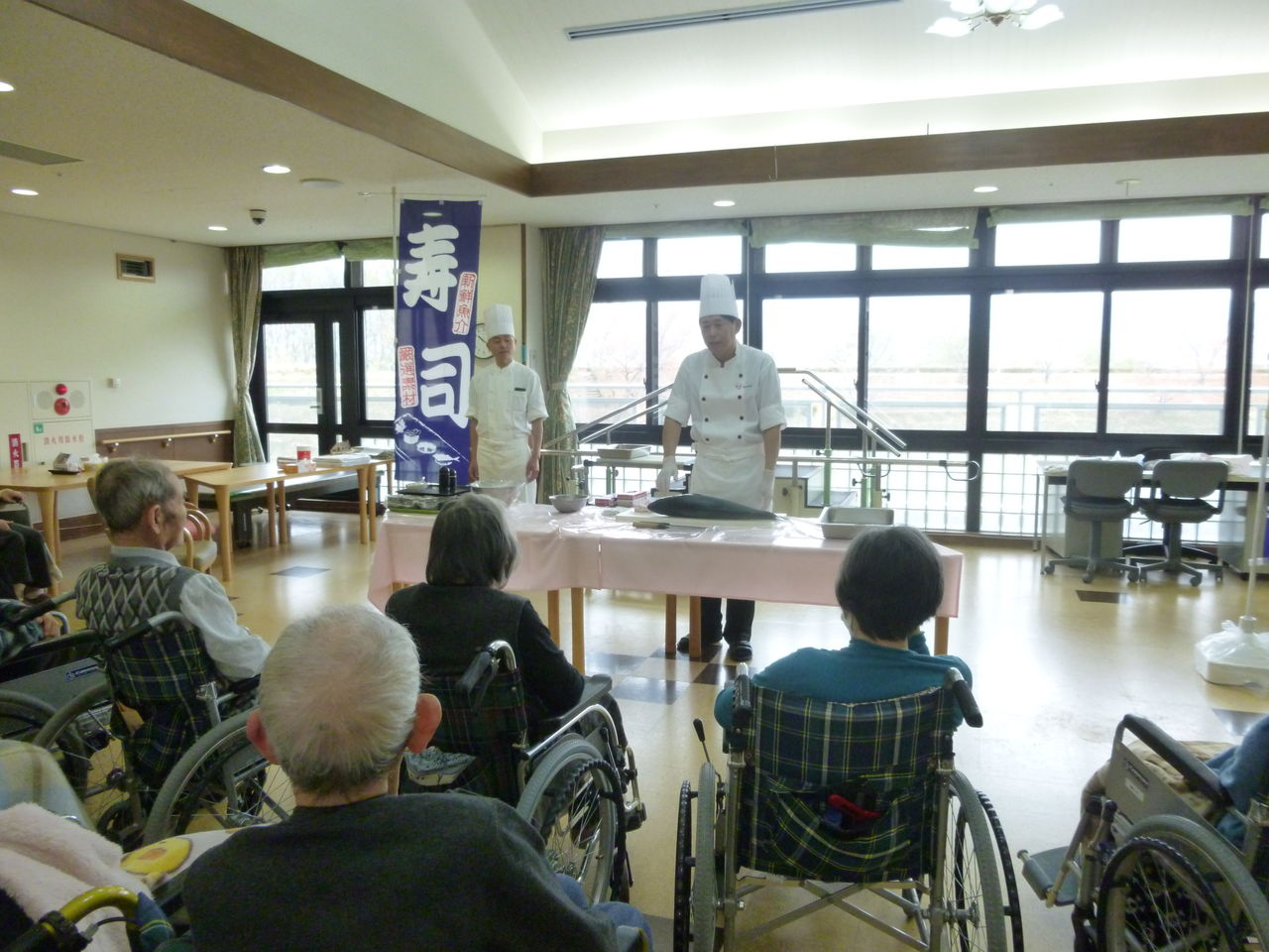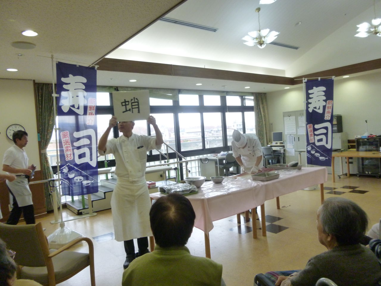 2階のホールにて、ミールケアのスタッフさんが魚に関するクイズを出したり、ご利用者の目の前ではまちをさばいてくれました。皆さん、その包丁さばきを真剣にご覧になっていました。