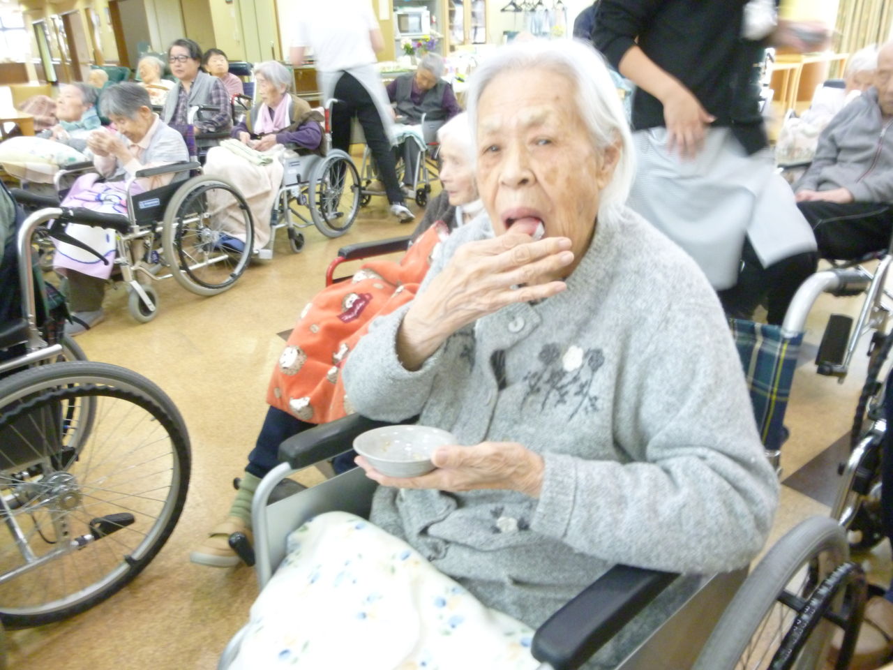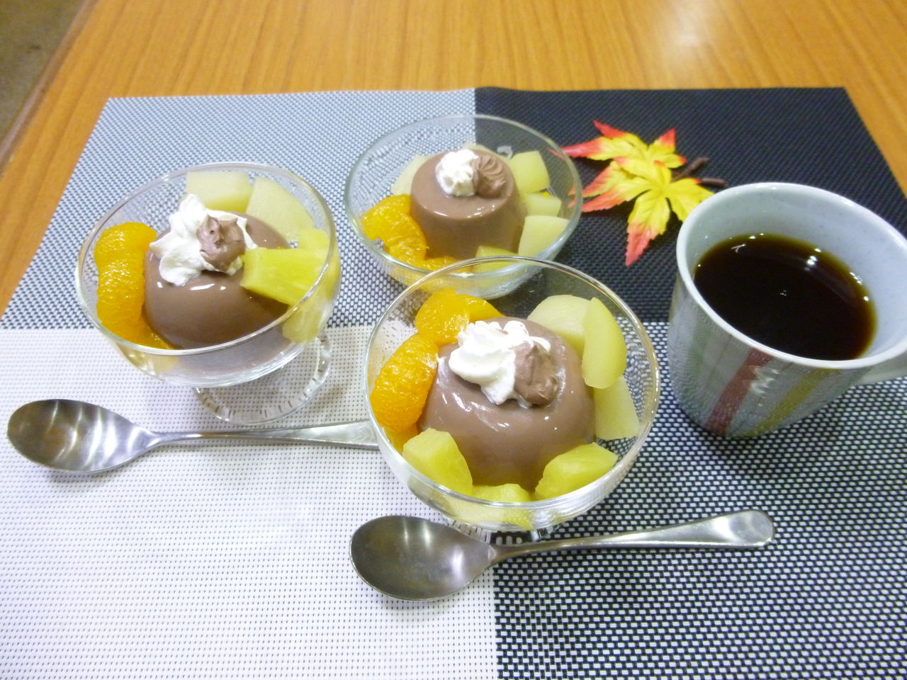 10月の終わりにはおやきと豆乳プリン、今月はバナナケーキとりんごゼリー、白玉団子と黒ごまゼリー、チョコプリンアラモード、抹茶あんみつ、抹茶ゼリーとバラエティーに富んだおやつを提供いたしました