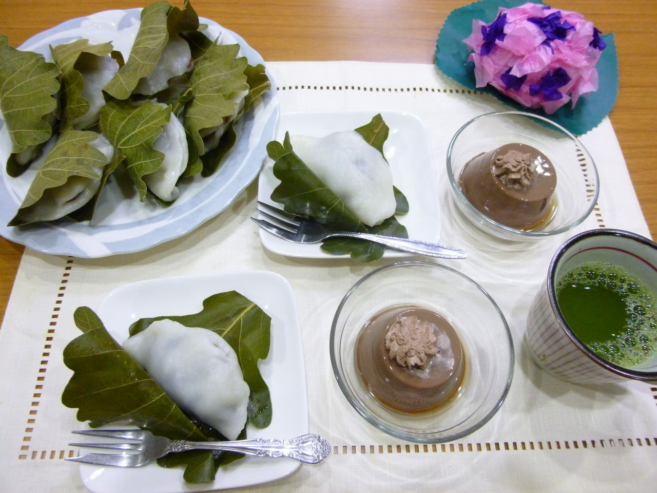 6/5の柏餅とココアプリン、チーズ蒸しパンとりんごゼリー、わらびもちと豆乳ゼリー、おやきと黒ごまプリン、人参ケーキとバナナプリン