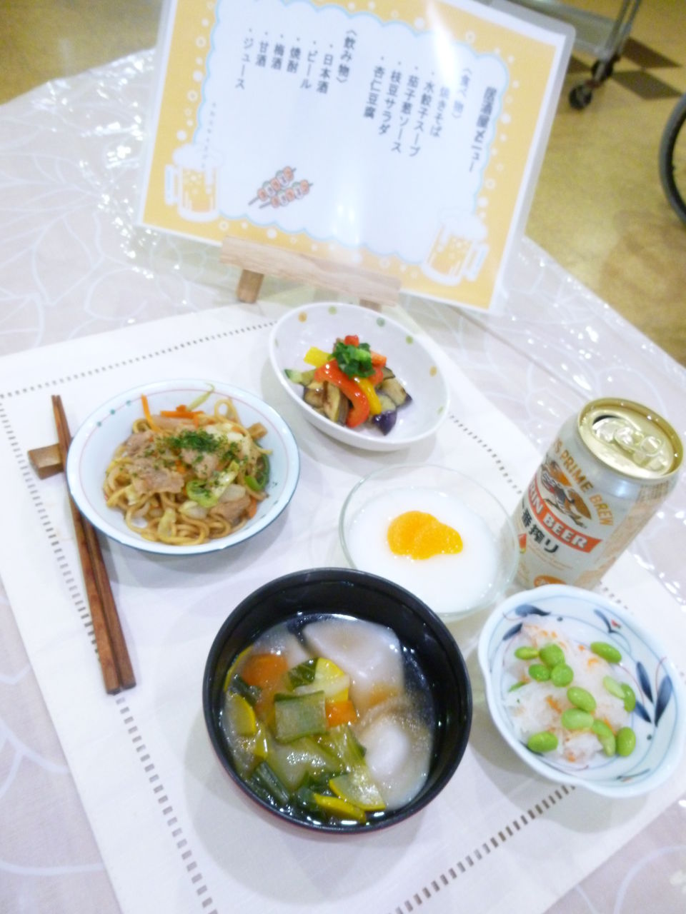 今回は焼きそば、水餃子、茄子の葱ソース、枝豆サラダ、杏仁豆腐を召し上がっていただきました。