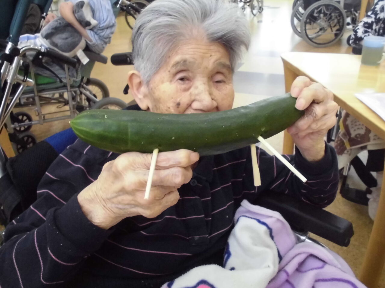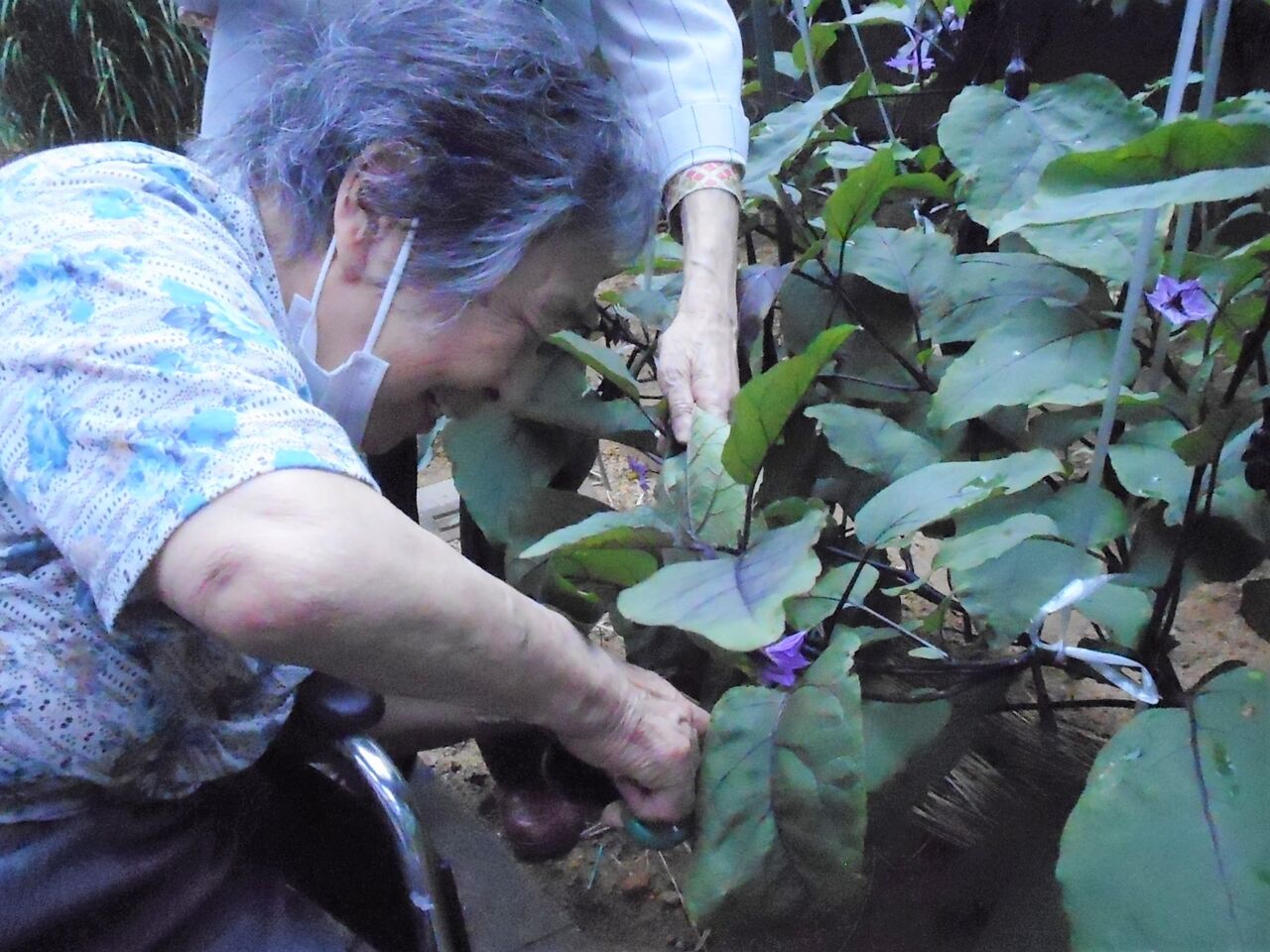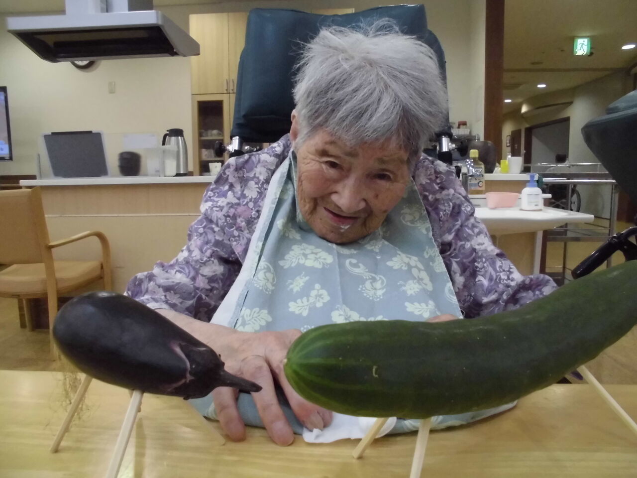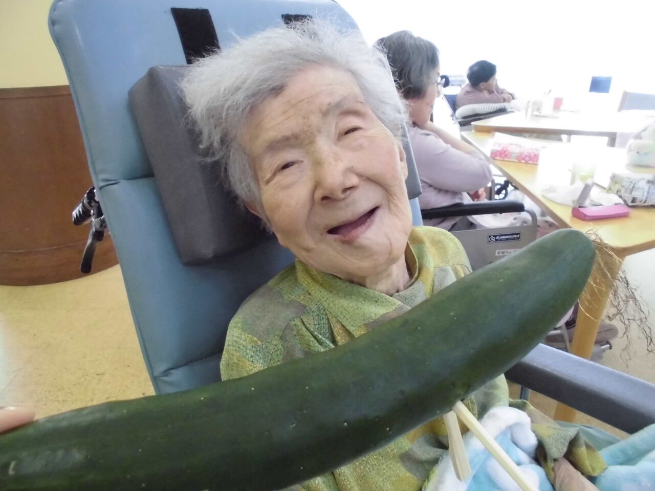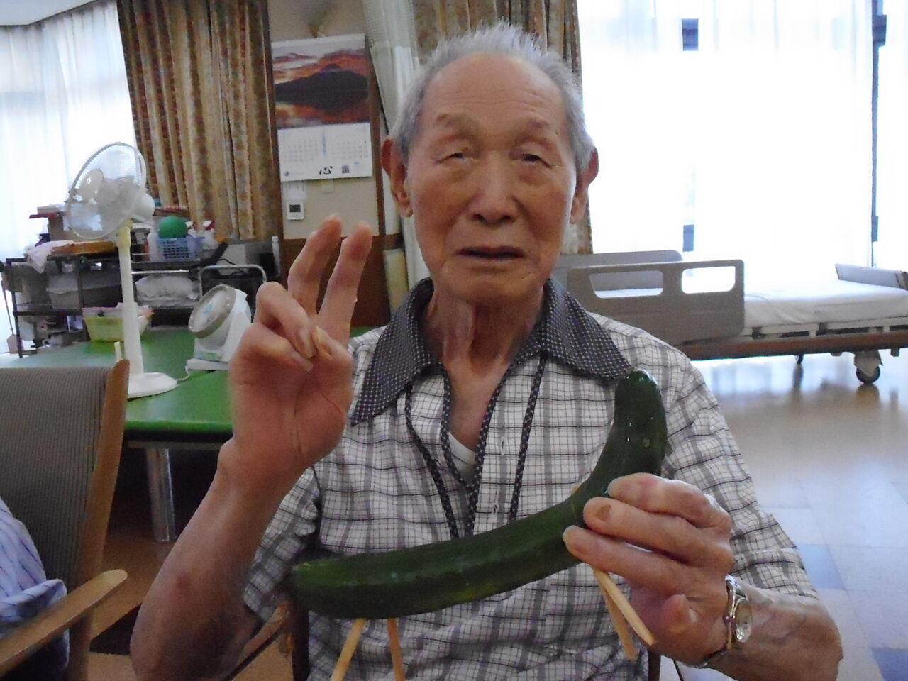 「こんなに大きいの?」「よく成ったね。」「ナスつやつやしてる。今晩のおかずにしたらー?」と嬉しい感想が聞かれました。この日職員もご利用者様もこの逞しい野菜からエネルギーをいただきました。