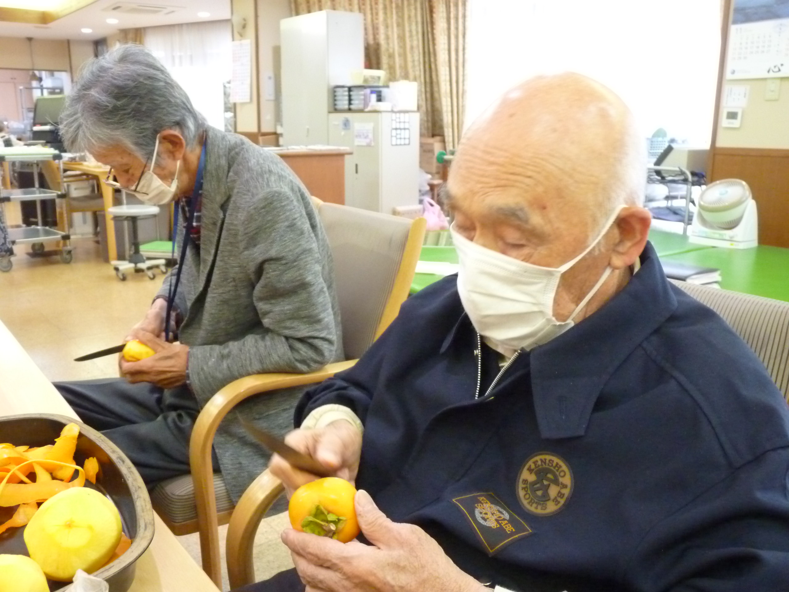 渋柿の皮をむきながら、柿にまつわる思い出話と世間話が弾みます。