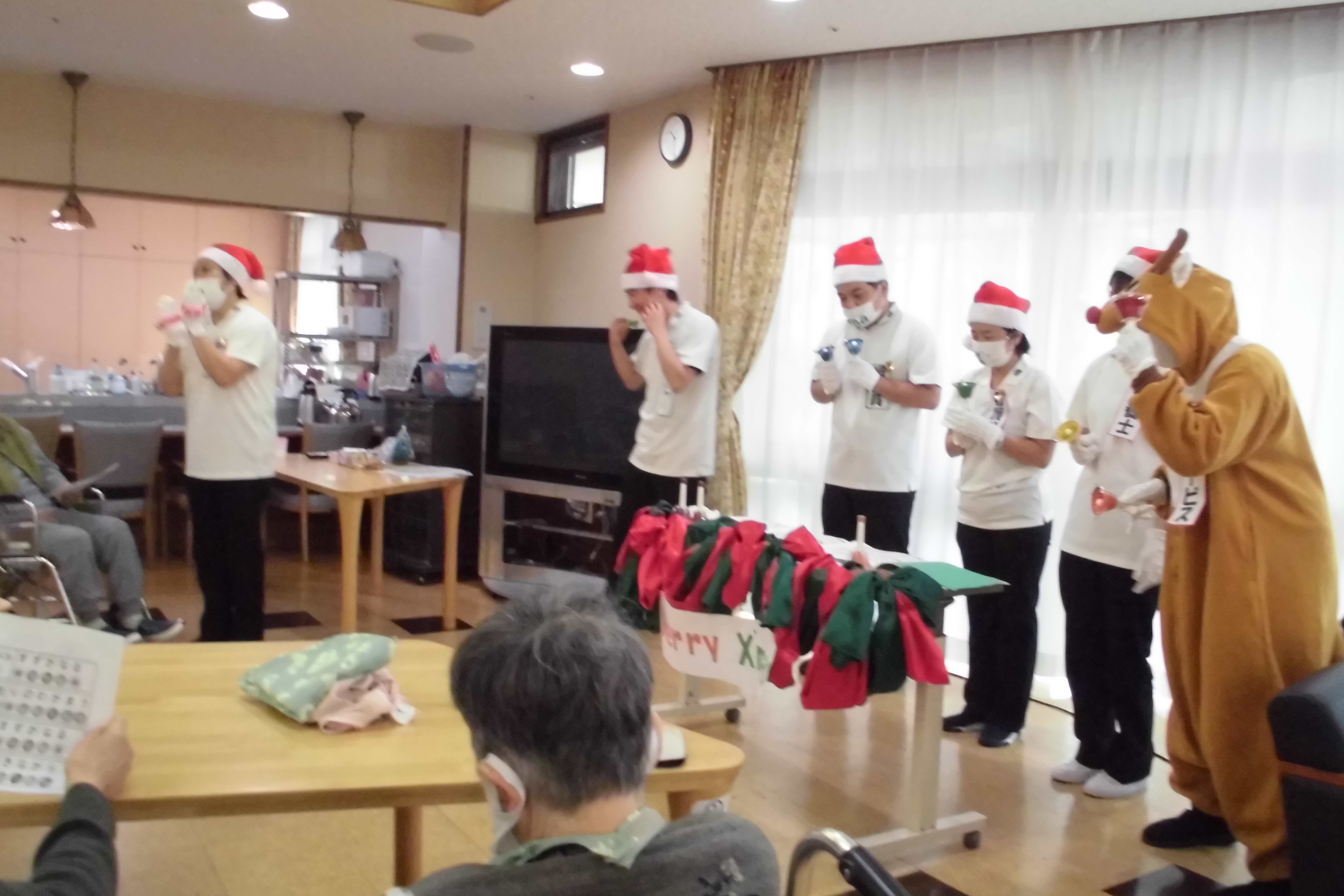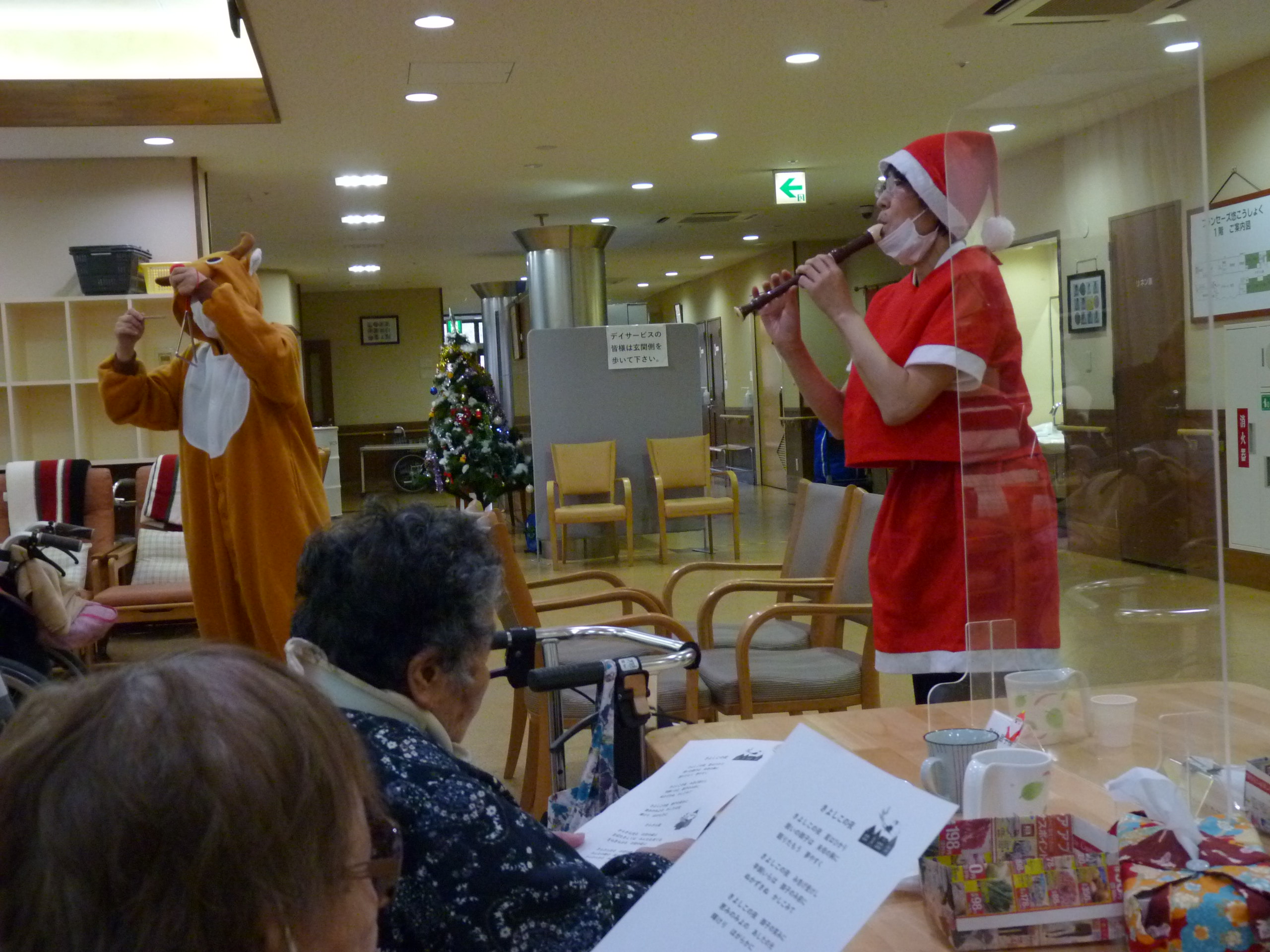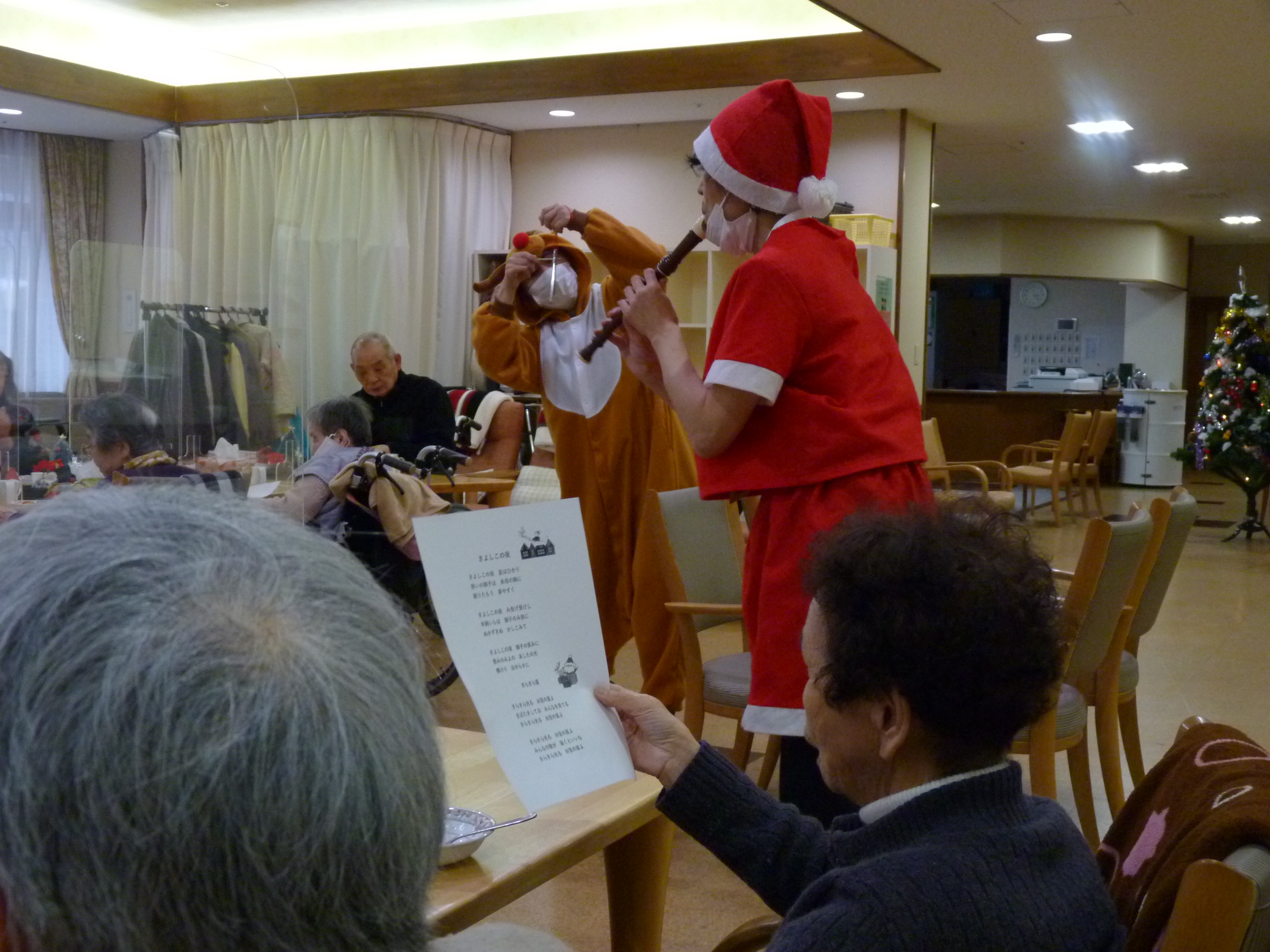 25日は、デイサービス職員らで、アンサンブル隊を結成。リコーダー・トライアングル・鈴で奏でました。