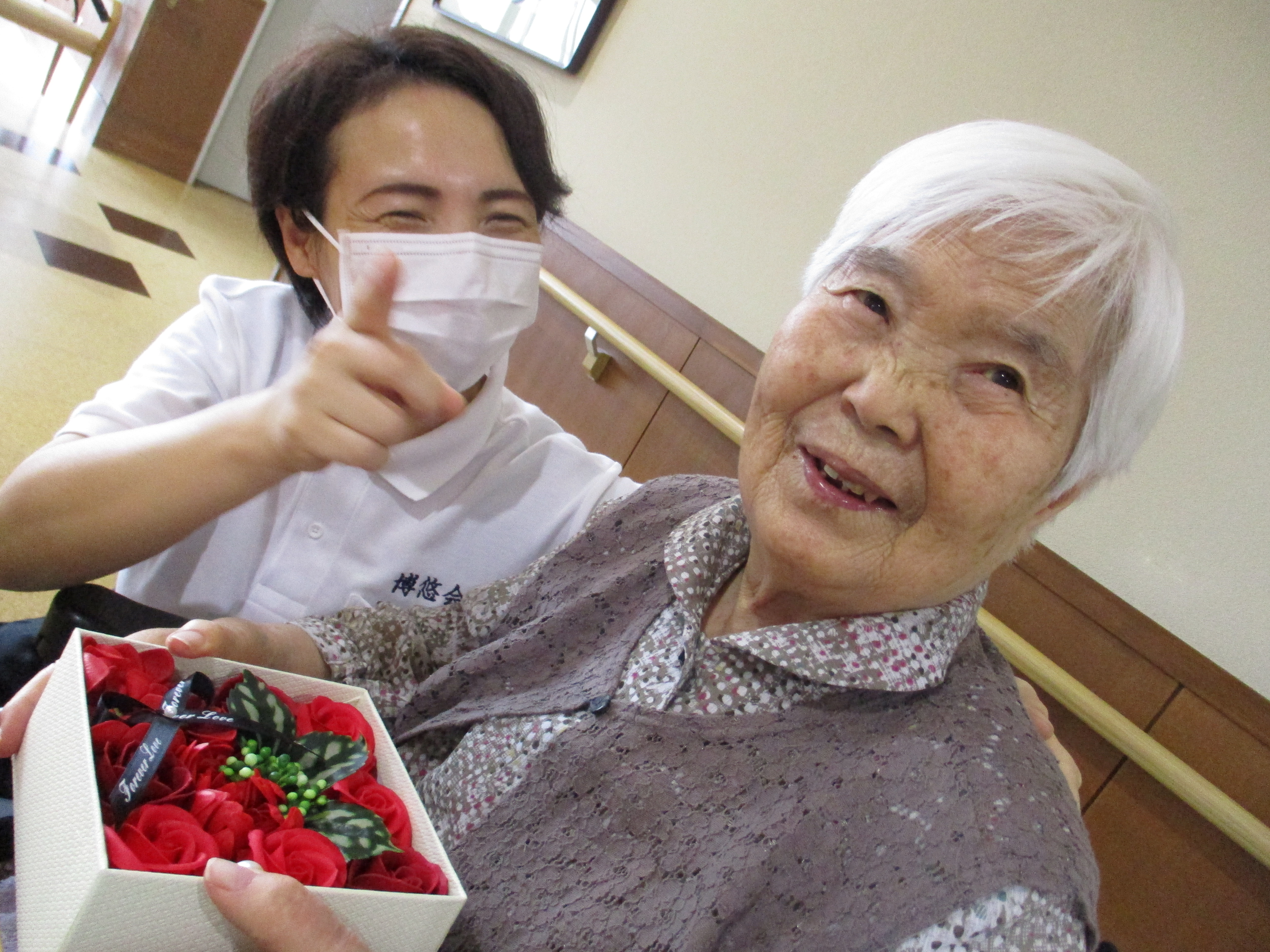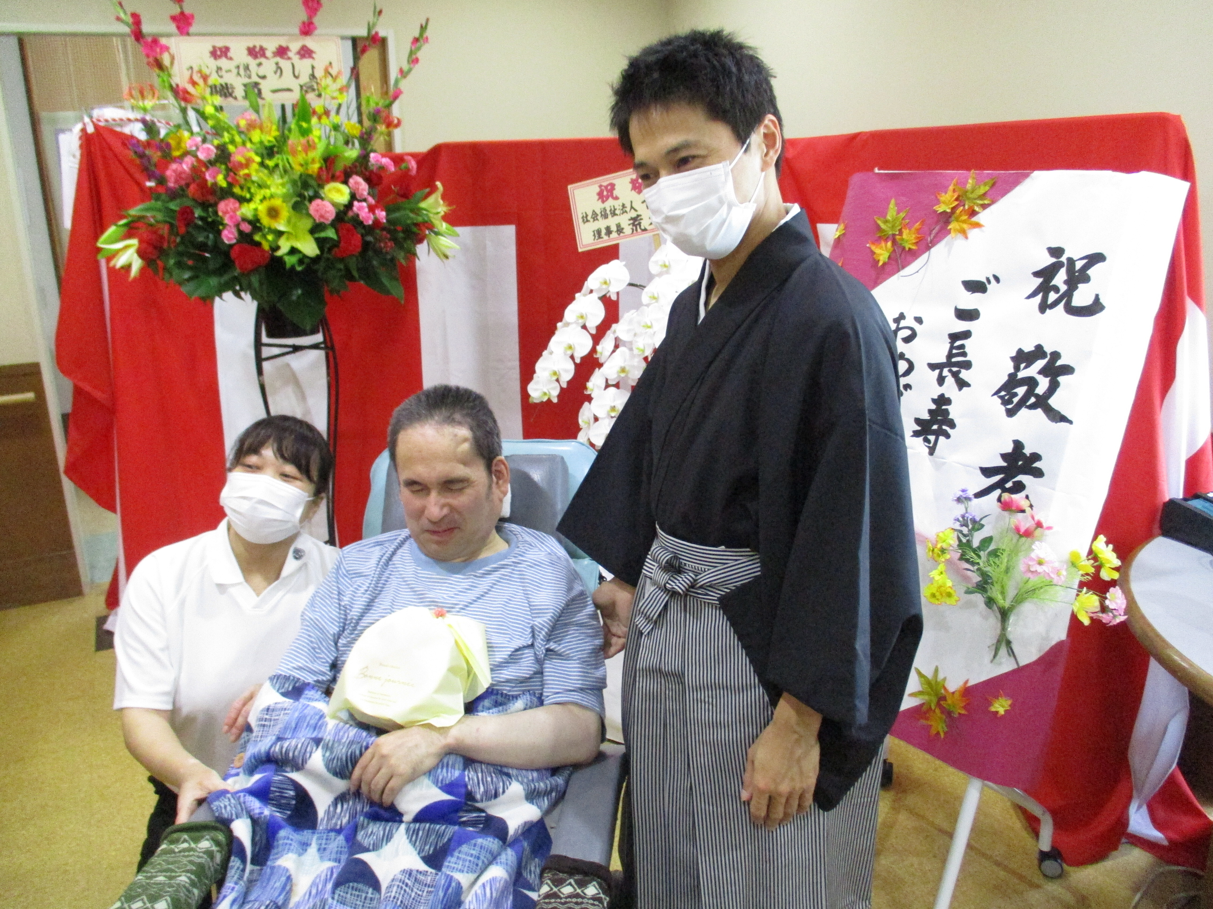 この日は朝からなんだかそわそわ!!女性のご利用者様にはちょっとおしゃれをして口紅をつけて参加。「おめでとうございます」の挨拶から始まり、ご利用者様も少し照れながらも