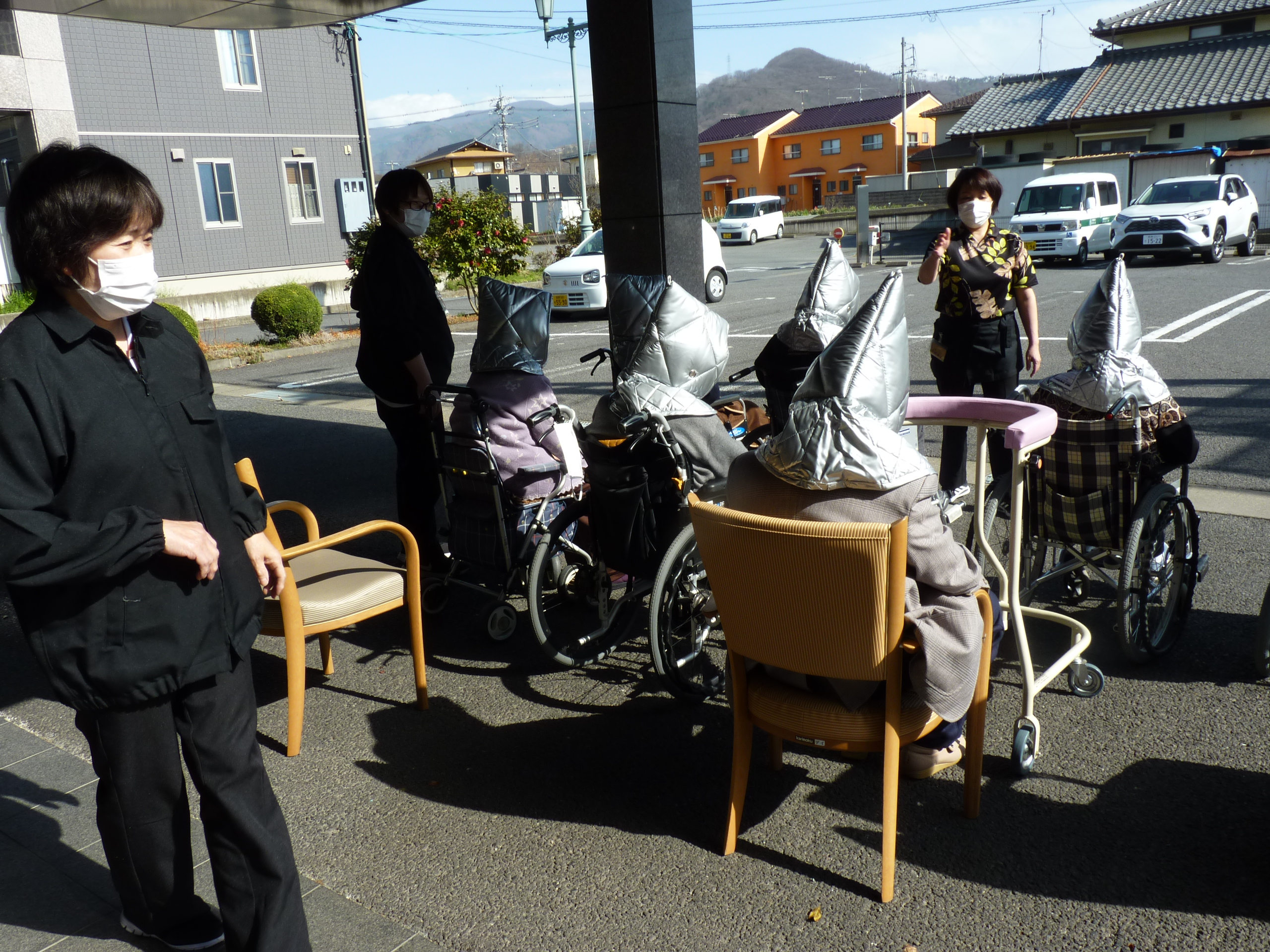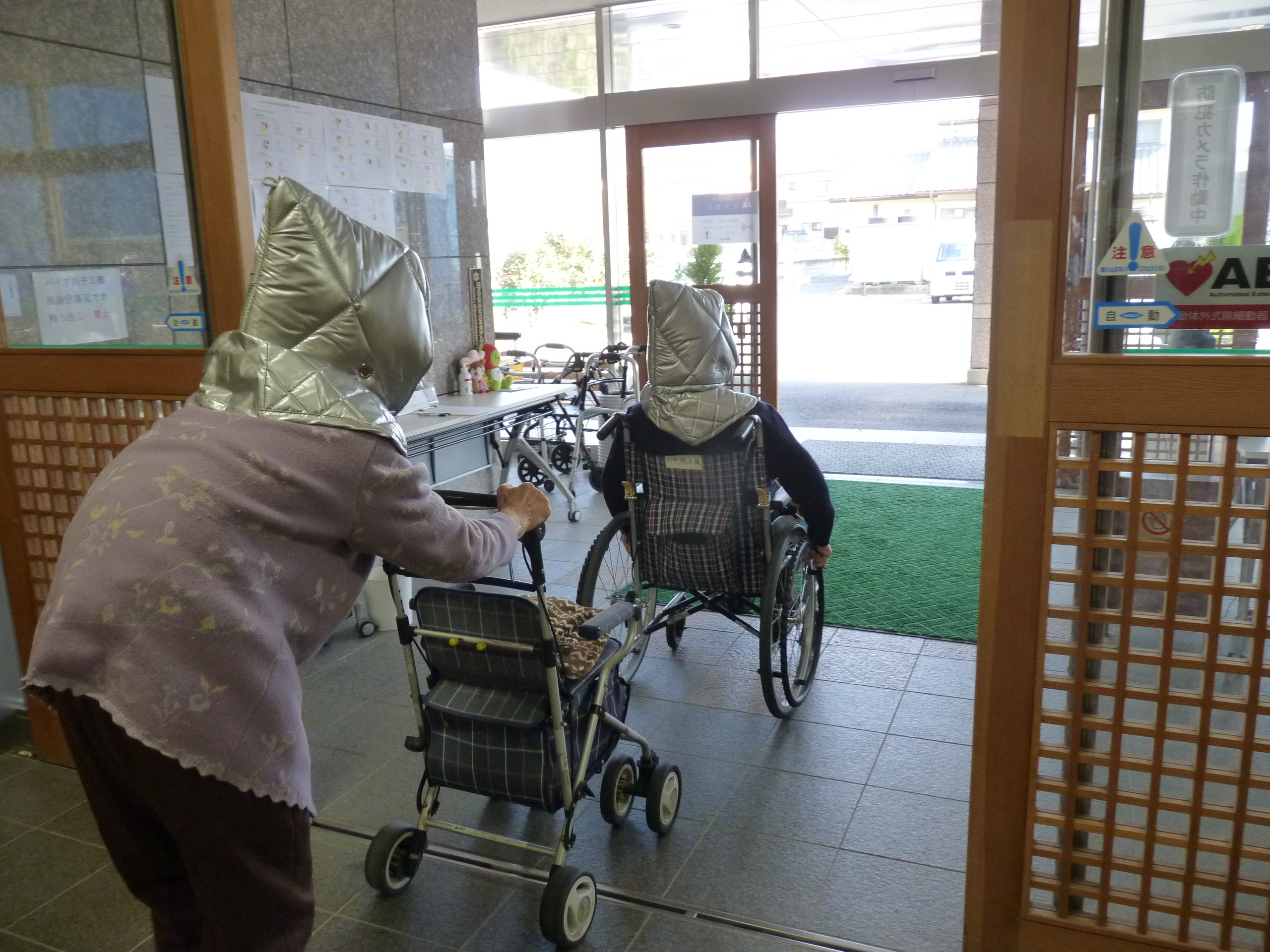 防災頭巾を被っていただき、調理室からの出火を想定して避難訓練です。