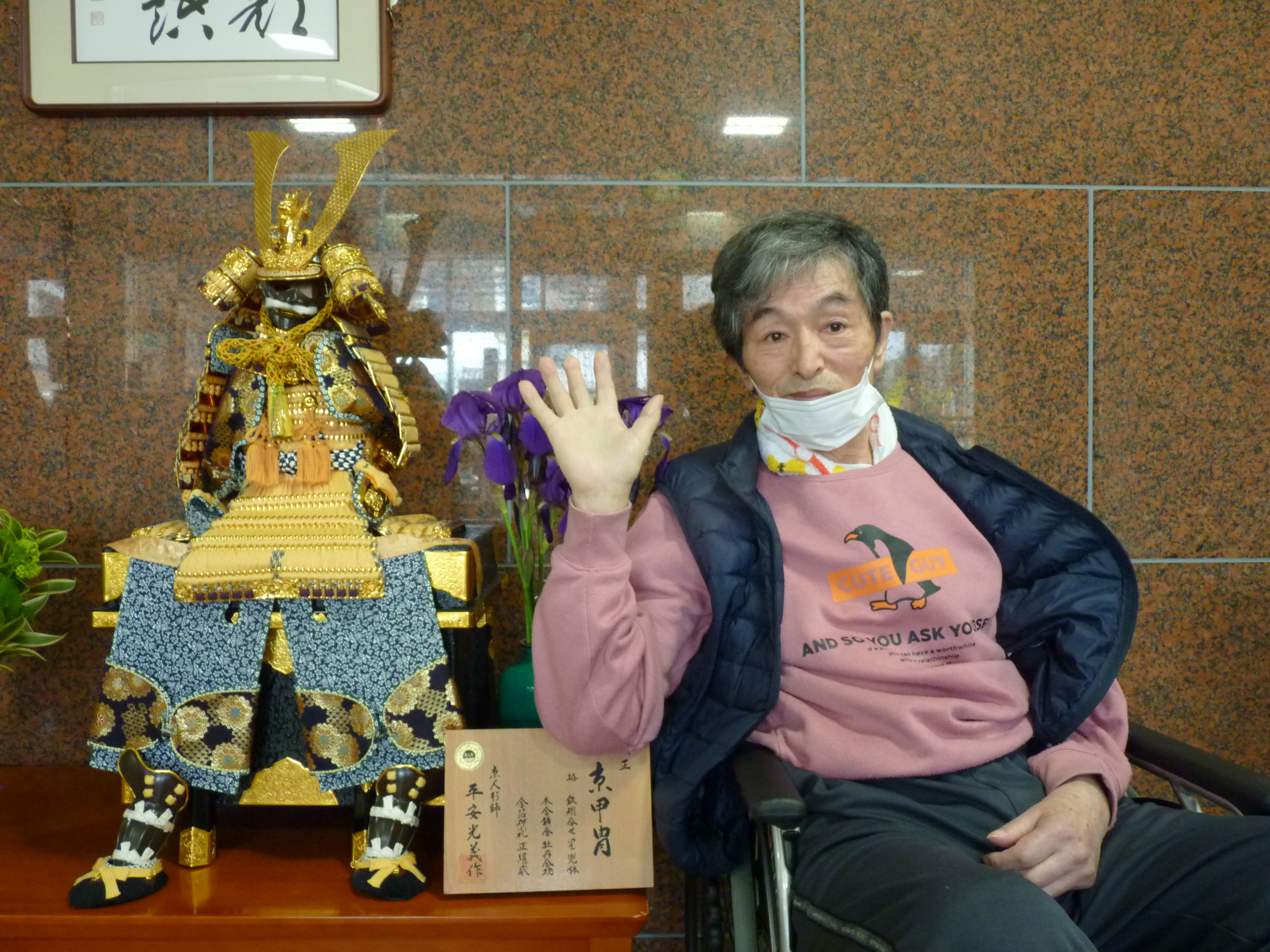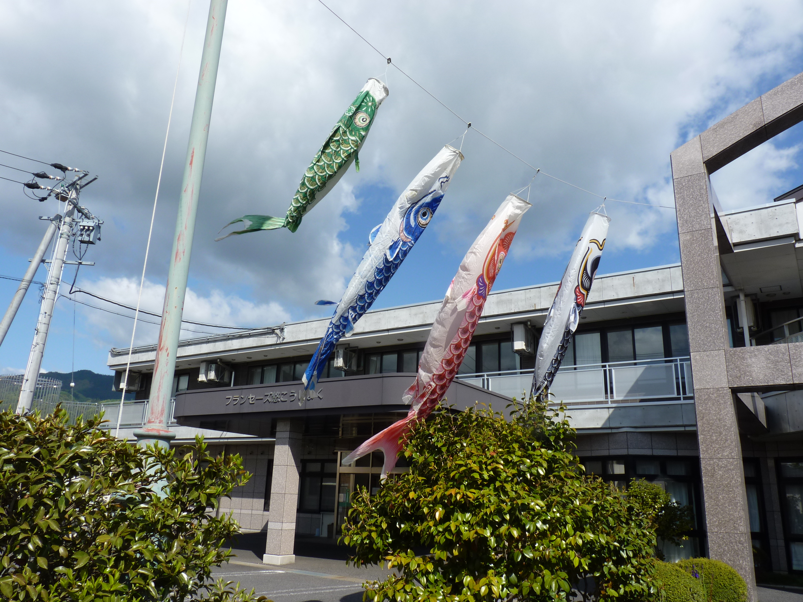 5月は、元気に空を泳ぐ「鯉のぼり」や煌びやかな「カブト」を飾りました。