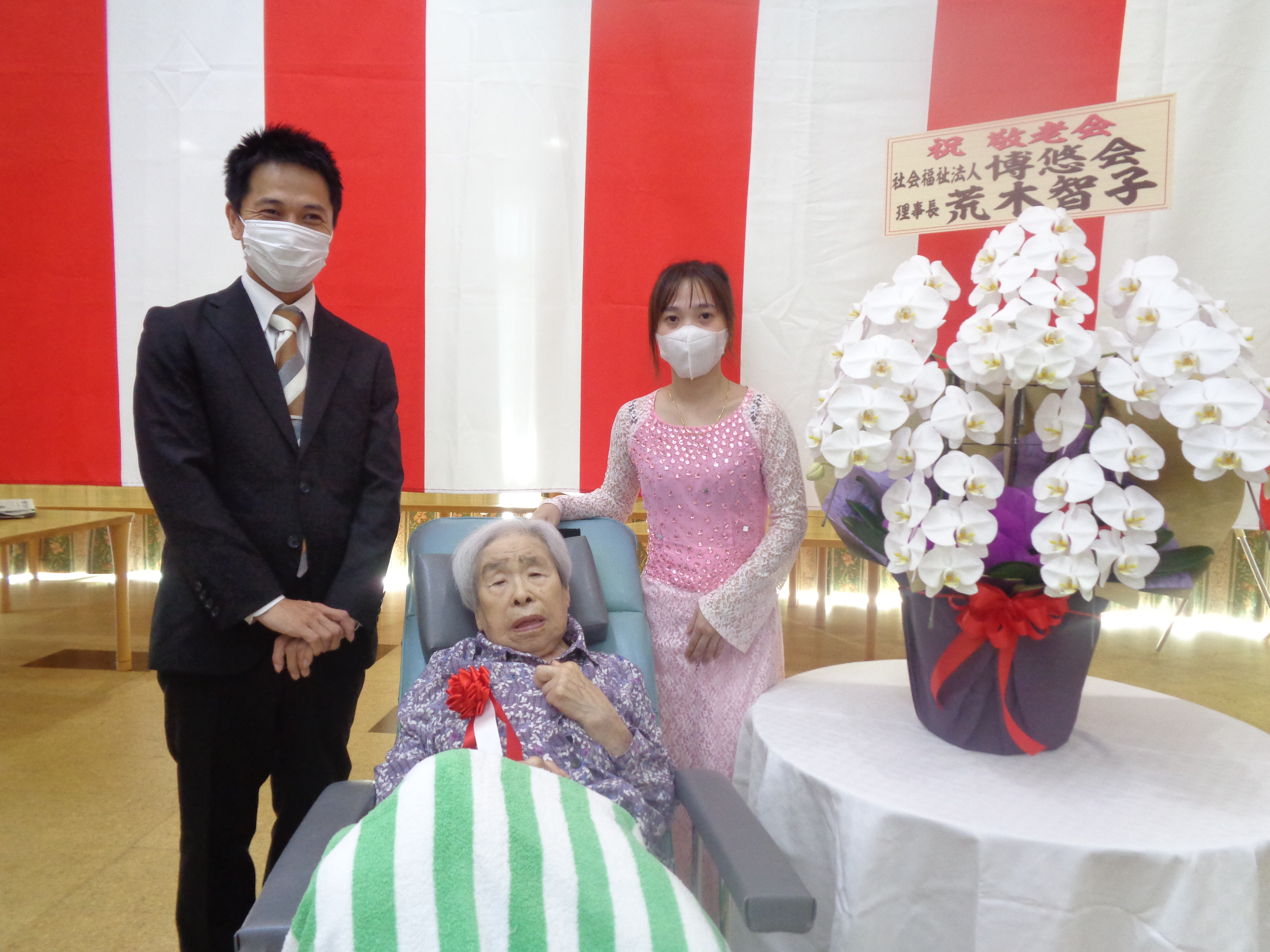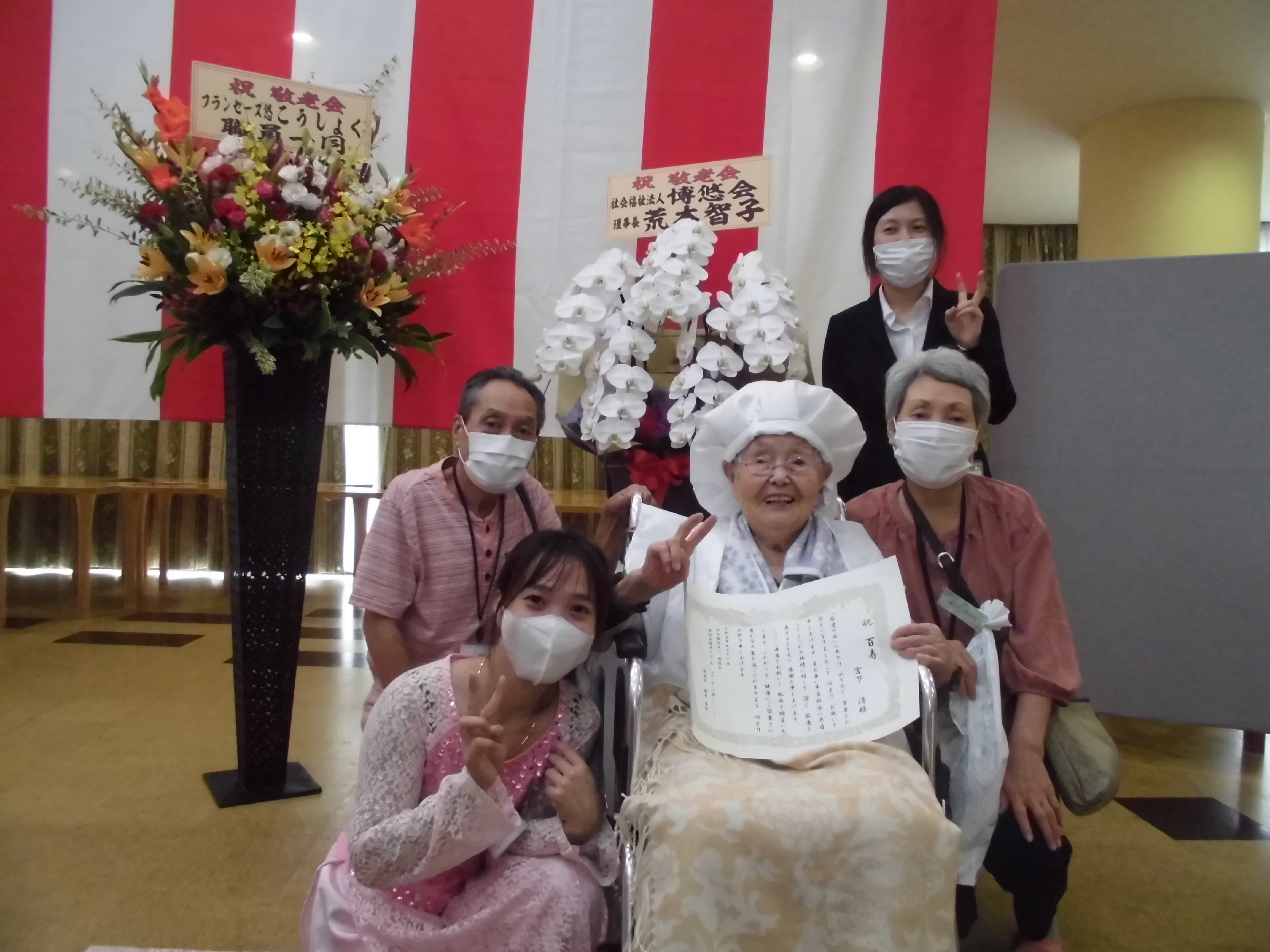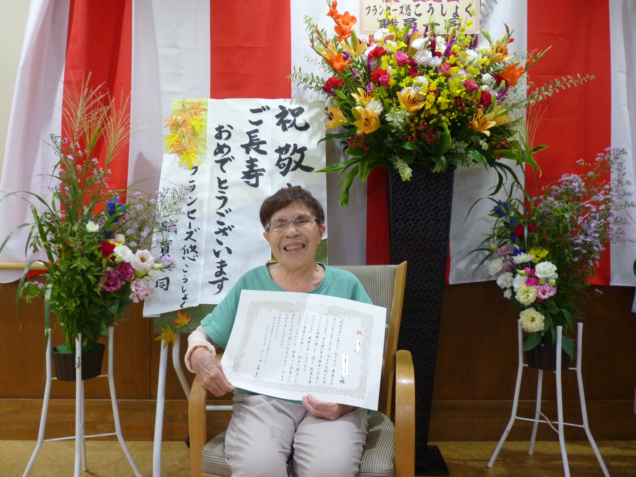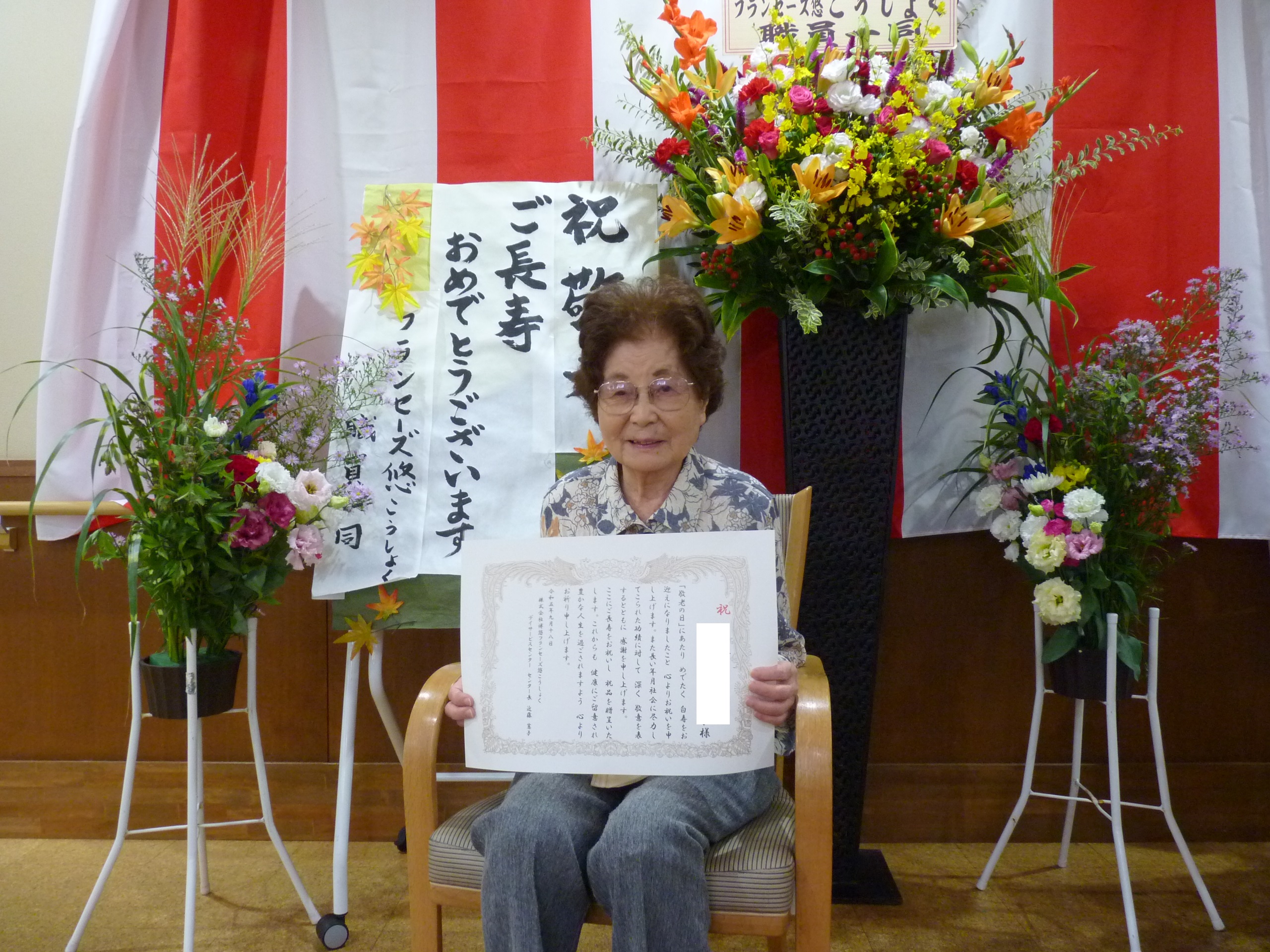 今年は、米寿2名、卒寿3名、白寿1名の方がいらっしゃいましたので、賞状と記念品の贈呈を行いました。