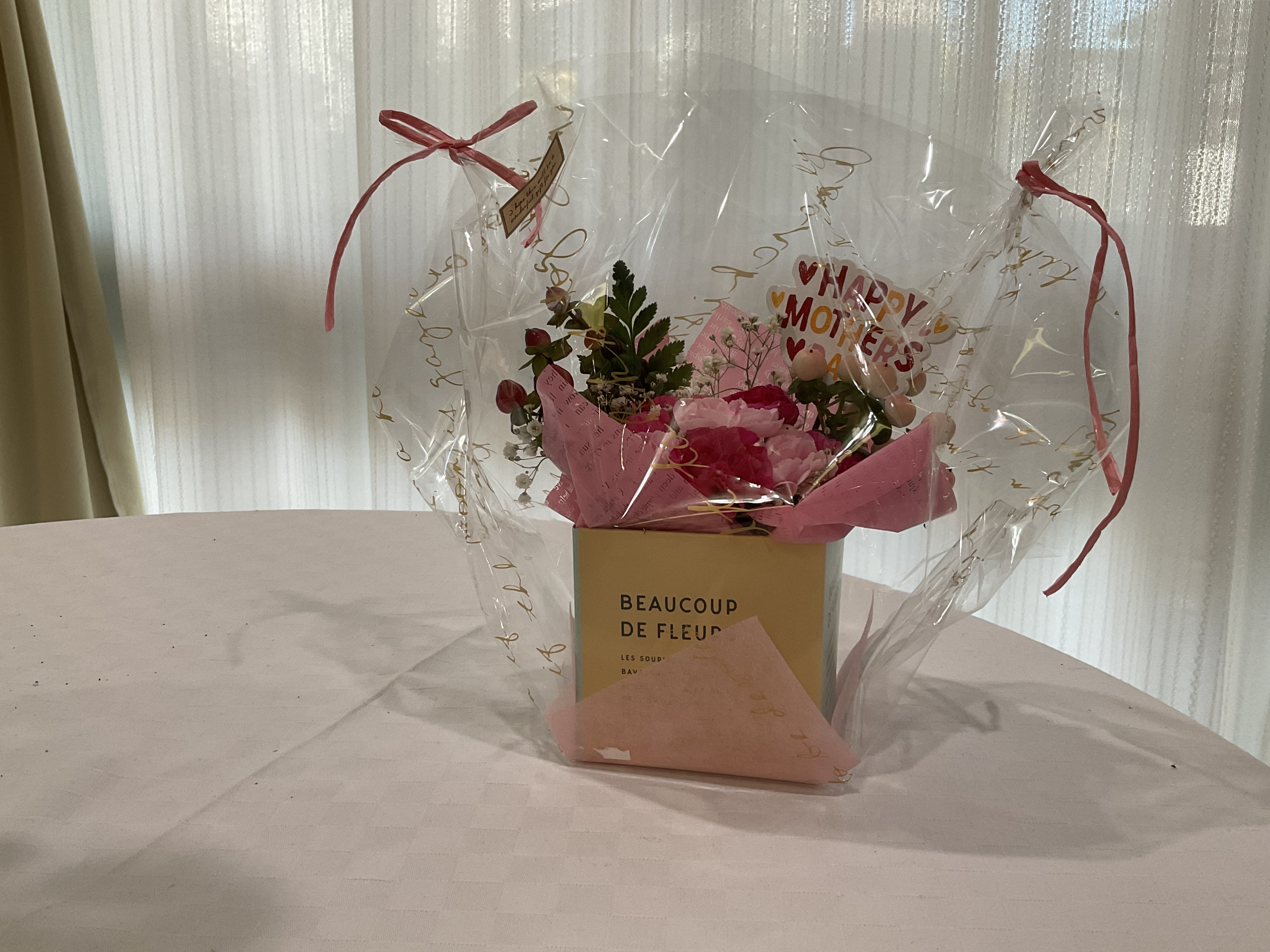 大きなカーネーションの花束をバックにとても素敵な笑顔でした