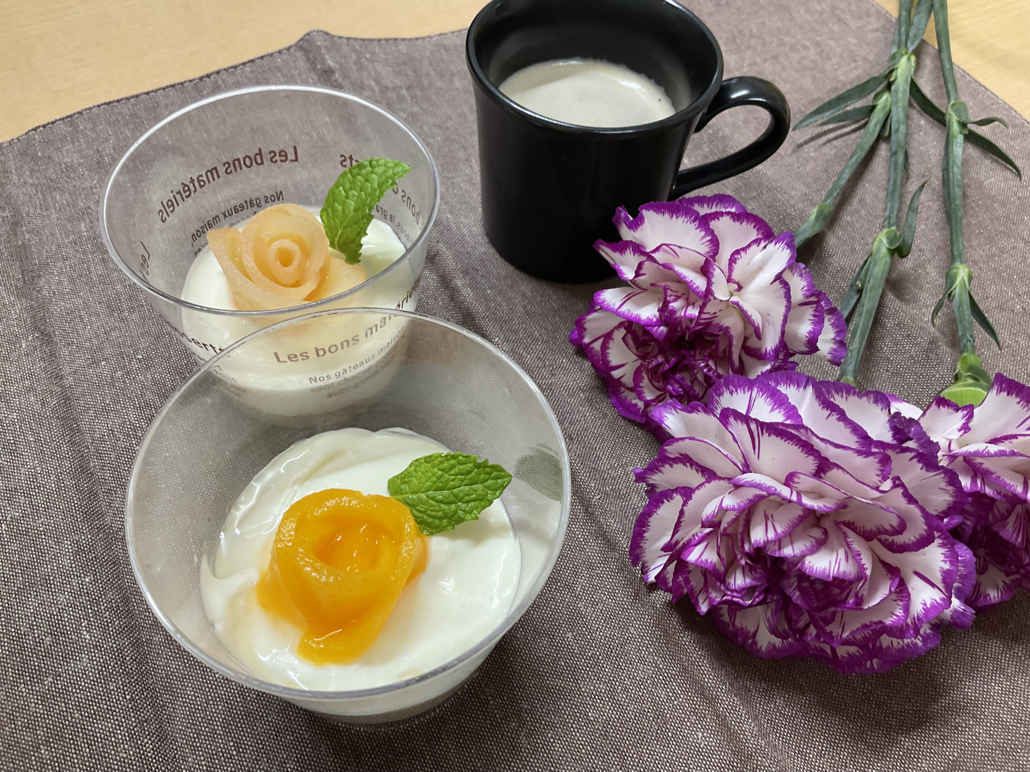 3時のおやつは、チーズケーキに桃であしらったバラをのせ召し上がっていただきました