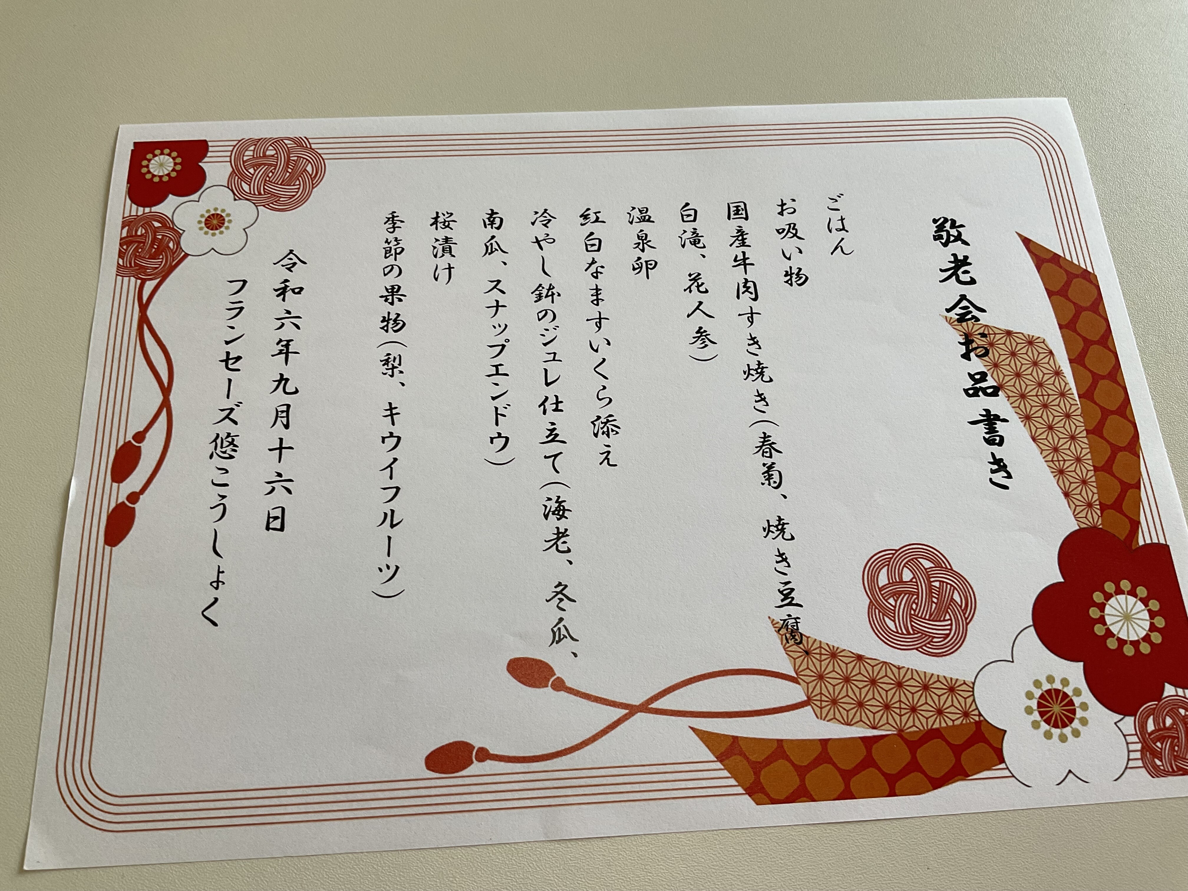 9月16日の敬老の日に、フランセーズ悠こうしょく敬老祝賀会を開催致しました。