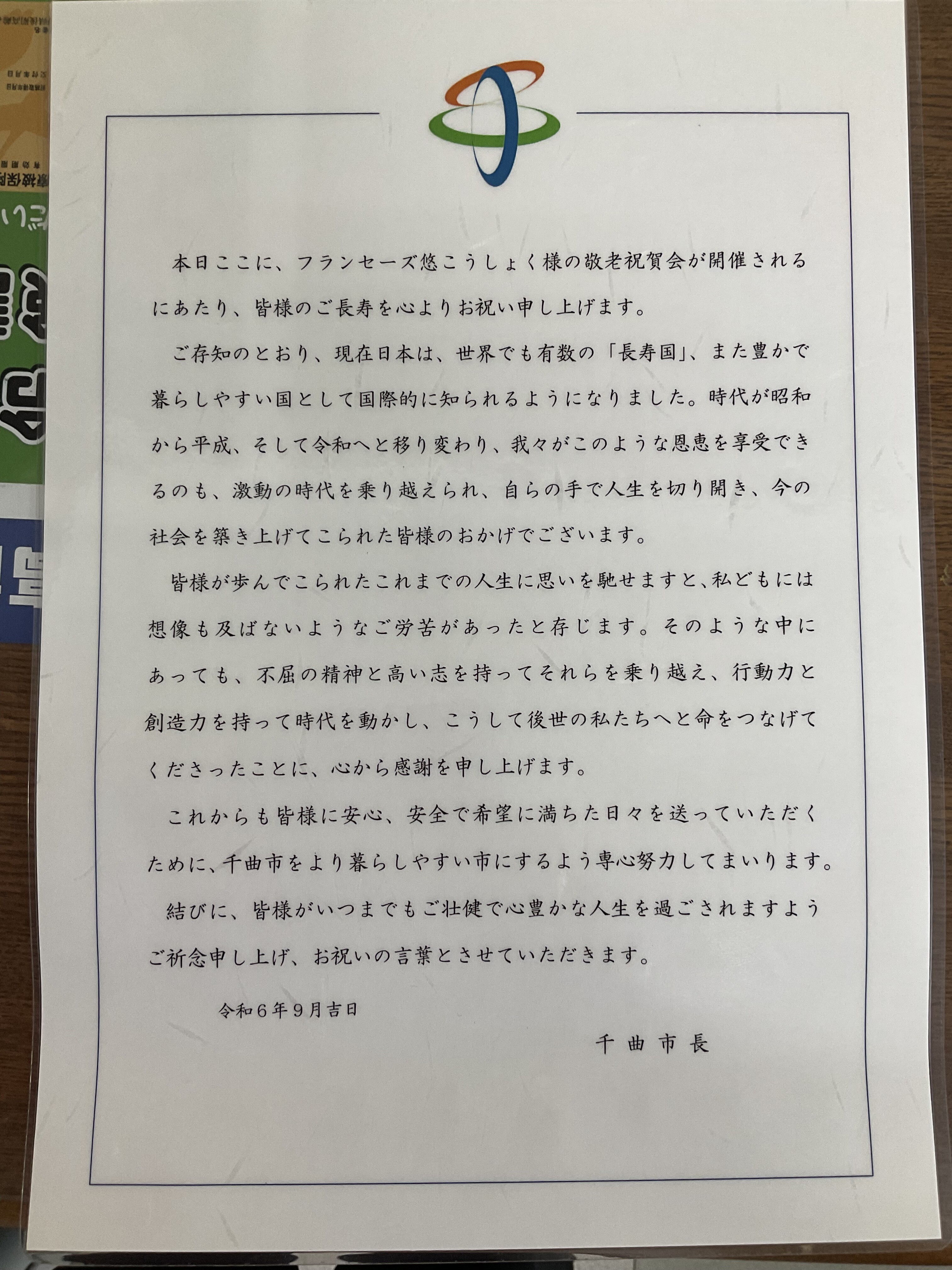 ご利用者様を代表してご挨拶もして頂きました 千曲市長より敬老の日のご祝辞を頂戴しました。