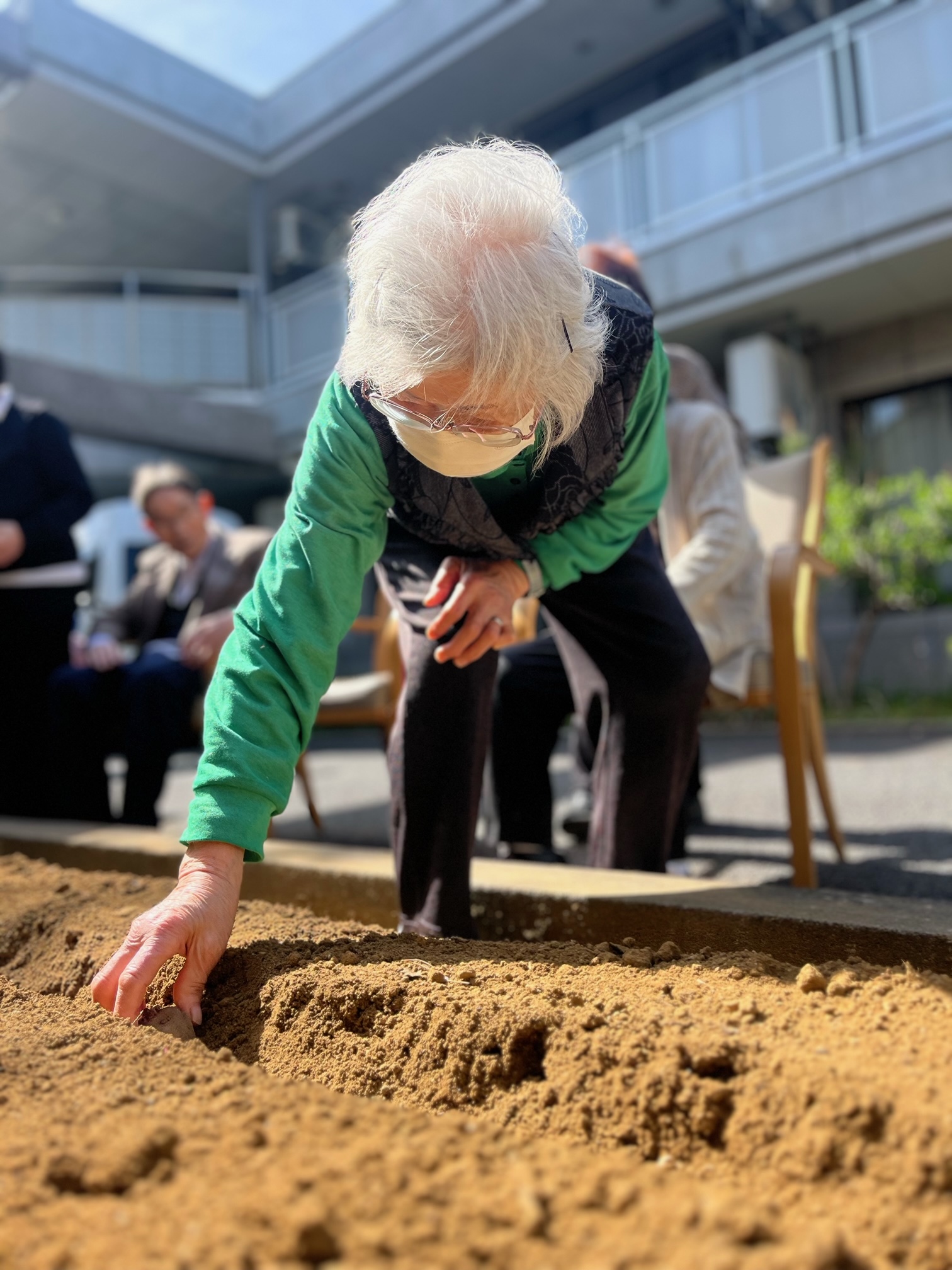 暖かい日差しの中で、ひとつひとつ丁寧にジャガイモの種をまいていく時間は